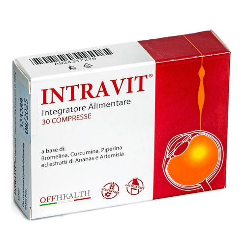 INTRAVITDescrizione Integratore alimentare a base di bromelina ed estratti di curcuma, artemisia, ananas e pepe nero. L'ananas favorisce il normale drenaggio dei liquidi corporei (pesantezza delle gambe) e la normale funzionalità del microcircolo, mentre la curcuma, il pepe nero e l'artemisia sono noti per la loro spiccata attività antiossidante. Ingredienti Curcuma (Curcuma longa L.) rizoma e.s. tit. 95% curcumina; agente di carica: cellulosa microcristallina; bromelina 2.400 GDU/g, artemisia (Artemisia dracunculus L.) parte aerea con fiori e.s. rapporto D/E 4:1, calcio fosfato tribasico, amido di mais, ananas [Ananas comosus (L.) M...